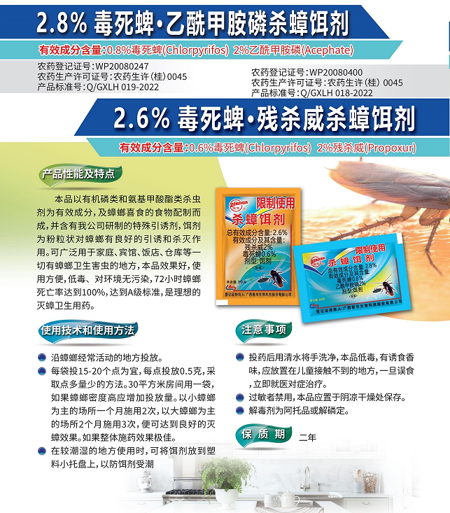 2.8%毒死蜱•乙酰甲胺磷杀蟑饵剂、2.6%毒死蜱•残杀威杀蟑饵剂