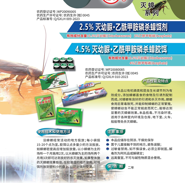 2.5%灭幼脲•乙酰甲胺磷杀蟑饵剂、4.5%灭幼脲•乙酰甲胺磷杀蟑胶饵
